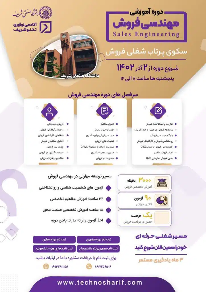 بنا بر گزارش روابط عمومی، دانشگاه صنعتی شریف درنظر دارد اولین دوره مهندسی فروش با رویکرد مهارت آموزی تخصصی و انجام تست‌های روانشناختی از تاریخ 2 آذر ماه سال جاری به مدت سه ماه در قالب 50 ساعت آموزش کاربردی برگزار نماید.