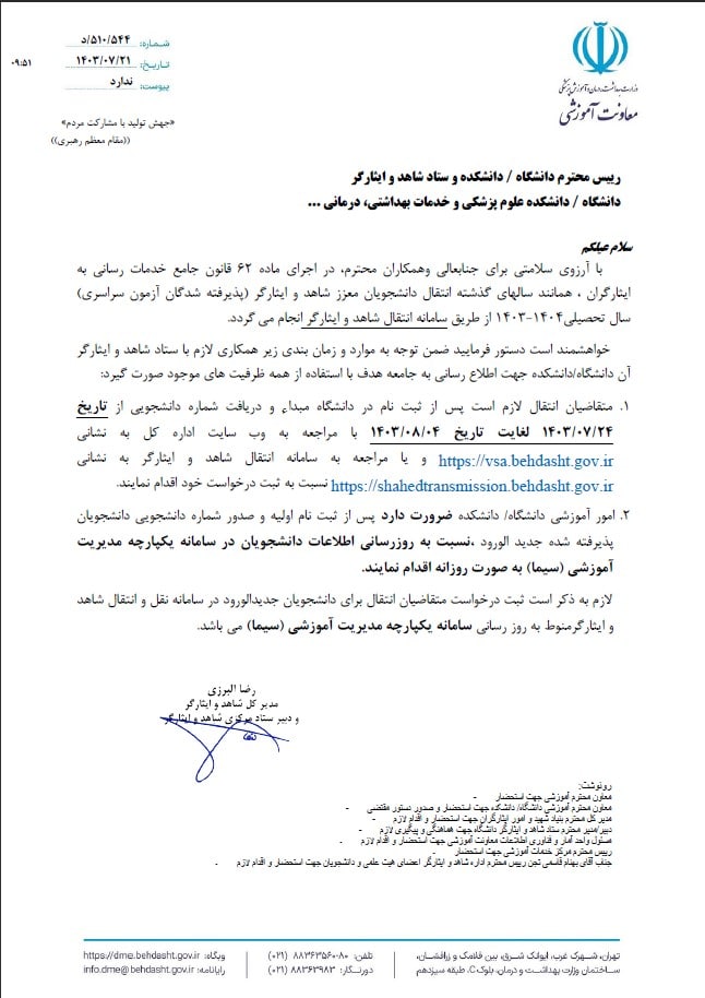 بخشنامه نقل و انتقالات دانشجویان شاهد و ایثارگر وزارت بهداشت جدید الورود نیمسال اول 1404-1403