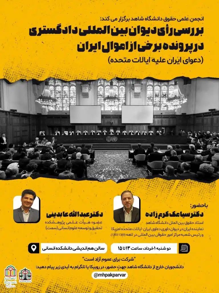 به گزارش «روابط عمومی» دانشگاه، “بررسی رای دیوان بین المللی دادگستری در پرونده برخی از اموال ایران” به همت انجمن علمی حقوق دانشگاه، دوشنبه ، ۱ خرداد ماه 1402 ساعت ۱۳ الی ۱۵ در سالن هم اندیشی ، دانشکده انسانی دانشگاه شاهد برگزار میگردد.
