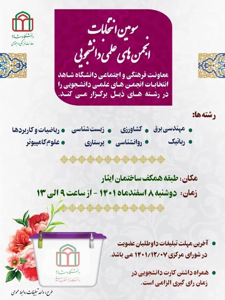 سومین انتخابات شورای مرکزی انجمن‌های علمی رشته‌های مهندسی برق، علوم کامپیوتر، ریاضیات و کاربردها، پرستاری، کشاورزی، زیست شناسی، رباتیک و روانشناسی روز دوشنبه مورخ 8 اسفندماه 1401 از ساعت 9 صبح در ساختمان ایثار برگزار می‌گردد.