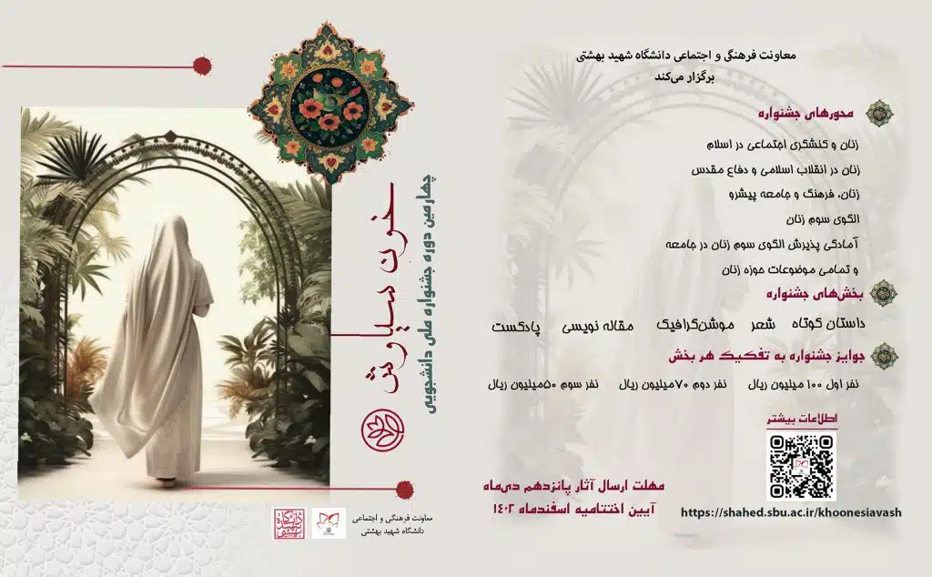 بنا بر گزارش روابط عمومی، چهارمین جشنواره ملی دانشجویی خون سیاوش با موضوع زنان و کنشگری اجتماعی در اسلام/ زنان در انقلاب اسلامی و دفاع مقدس/ زنان، فرهنگ و جامعه پیشرو، الگوی سوم زنان و… در قالب شعر، داستان کوتاه، مقاله نویسی، پادکست و موشن گرافیک توسط معاونت فرهنگی و اجتماعی مدیریت امور شاهد و ایثارگر دانشگاه شهید بهشتی برگزار میگردد.