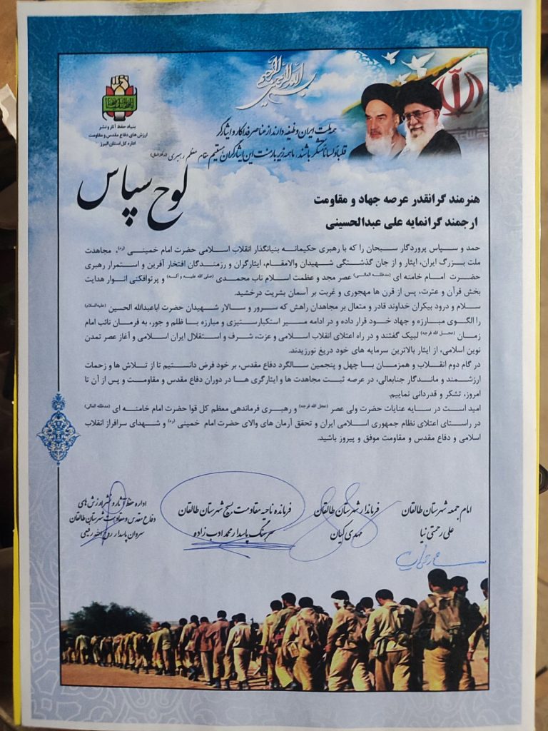 تقدیر از آقای علی عبدالحسینی، کارشناس دانشکده هنر، در هفته دفاع مقدس