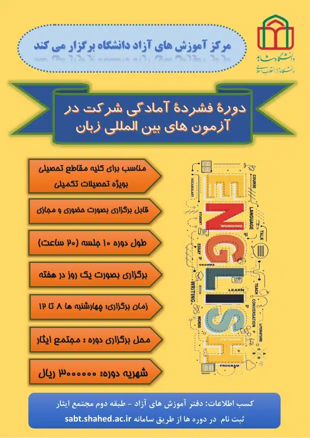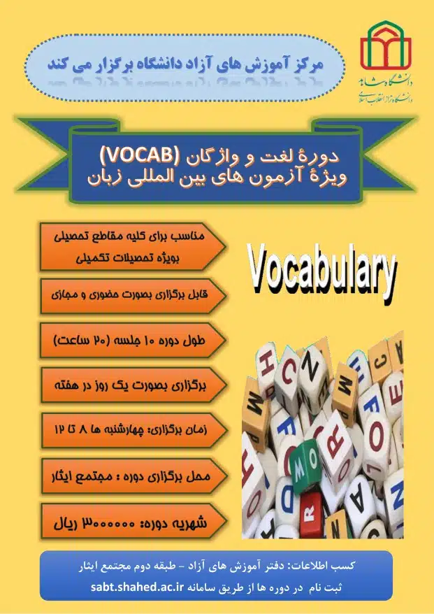 به گزارش«روابط عمومی» دانشگاه، مرکز آموزش های آزاد در نظر دارد دوره های آزاد زبان را در دو بخش ۱-دوره لغت و واژگان (Vocabulary) و ۲- دوره فشرده شرکت در آزمون های زبان، برای دانشجویان برگزار نماید.