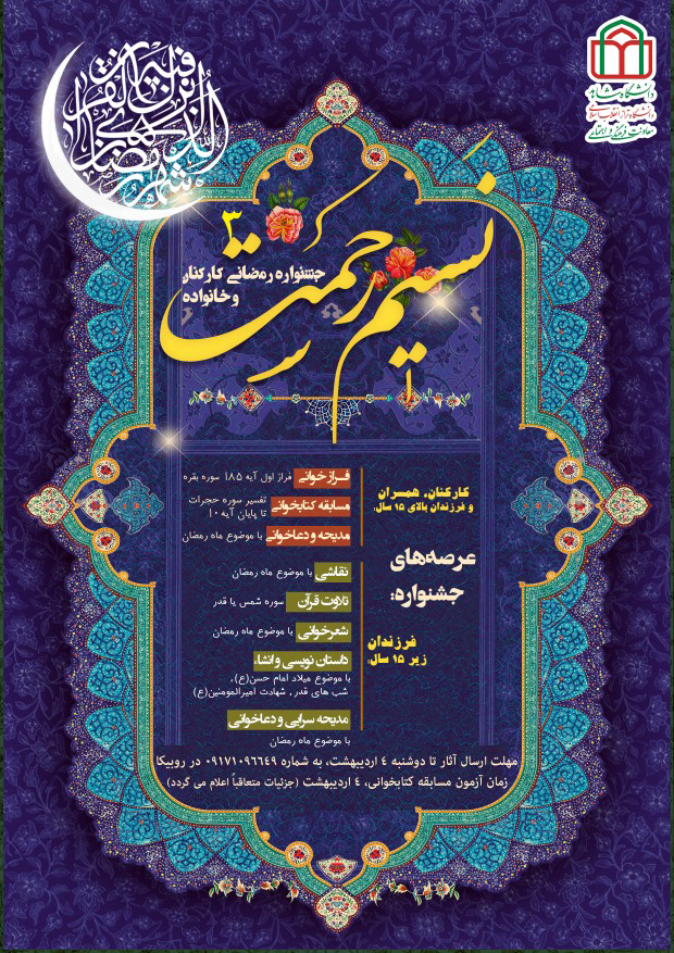 به گزارش «روابط عمومی» دانشگاه، سومین جشنواره رمضانی نسیم رحمت ویژه کارکنان دانشگاه و خانواده در در بخش های آوایی، هنری، ادبی و کتابخوانی برگزار میگردد.
