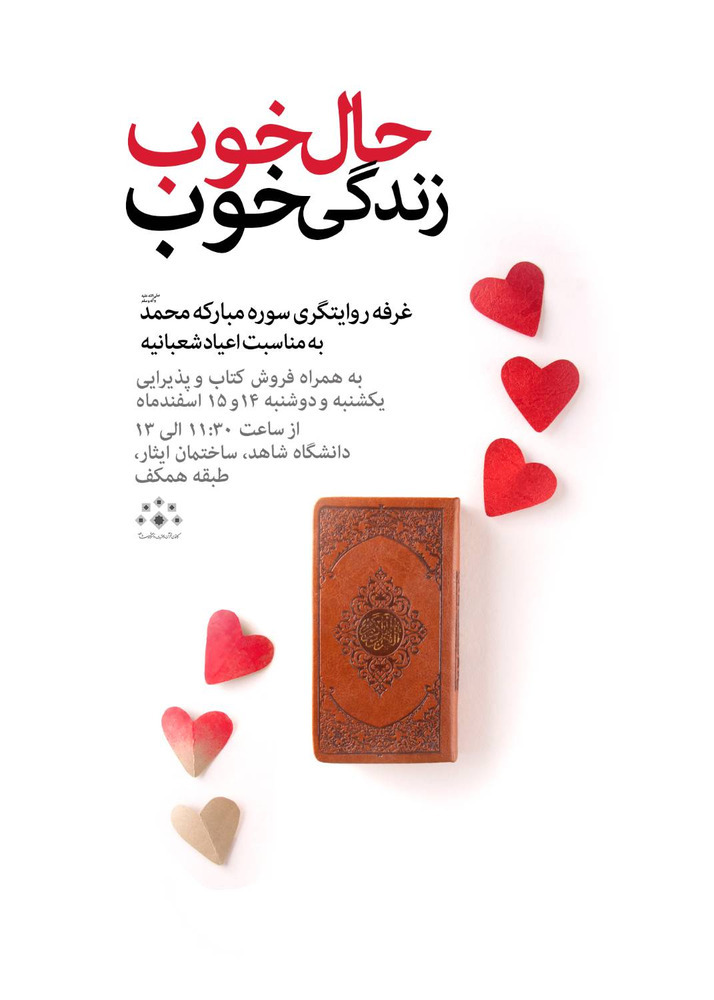 به گزارش «روابط عمومی» دانشگاه، غرفه روایتگری سوره مبارکه محمد صلی الله علیه و آله به همراه نمایش آثار تولید شده در رویداد انقلاب قلبها، یکشنبه و دوشنبه ۱۴ و ۱۵ اسفند ساعت ۱۱:۳۰ تا ۱۳:۰۰ در طبقه همکف ساختمان ایثار برگزار میگردد.