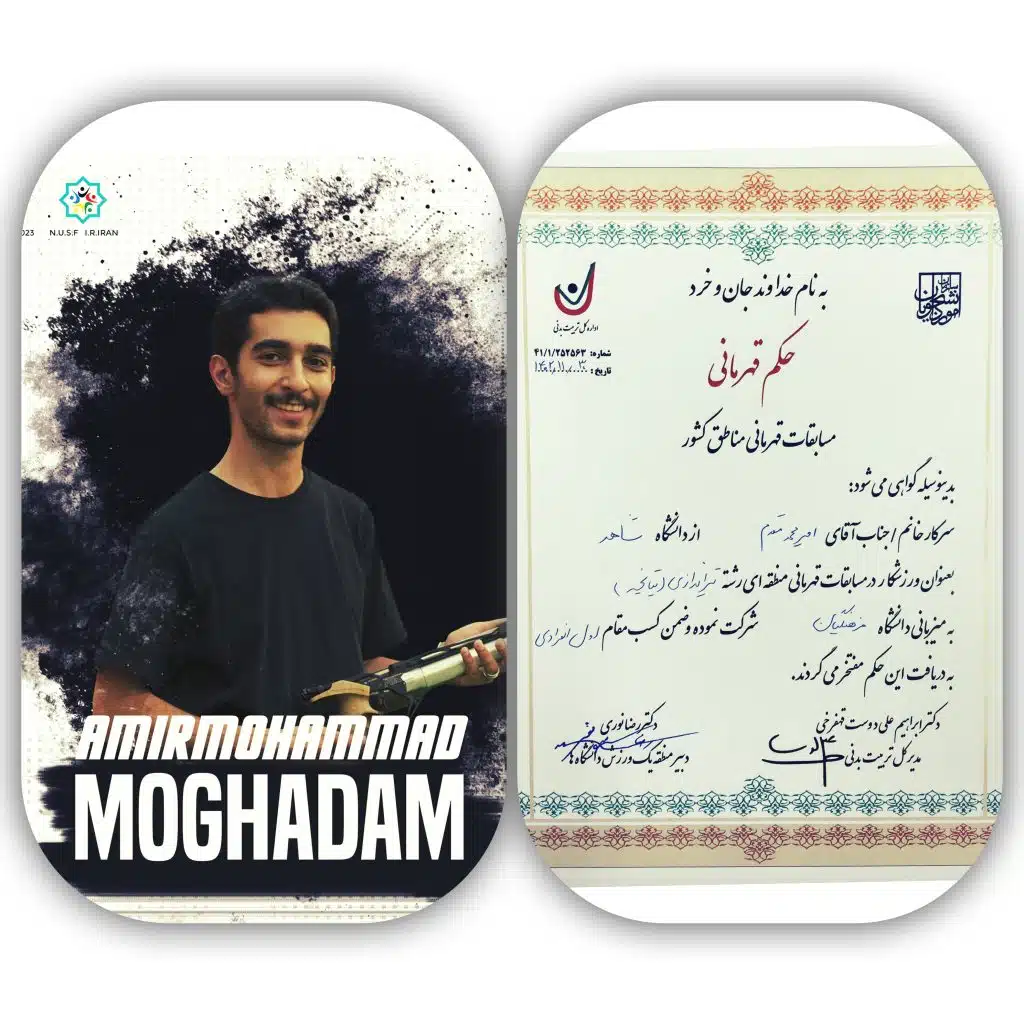کسب مقام اولی انفرادی مسابقات تیراندازی تپانچه دانشجویان پسرمنطقه یک کشور توسط امیر محمد مقدم دانشجوی دانشگاه شاهد