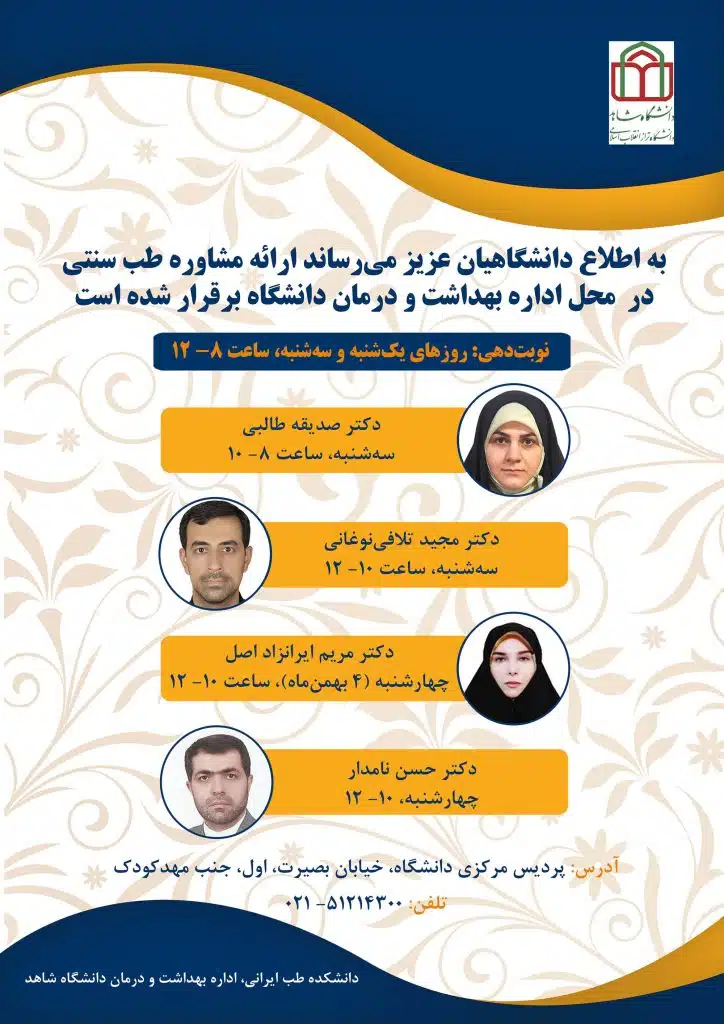نوبت دهی: روزهای یکشنبه و سه‌شنبه ساعت 8 الی 12