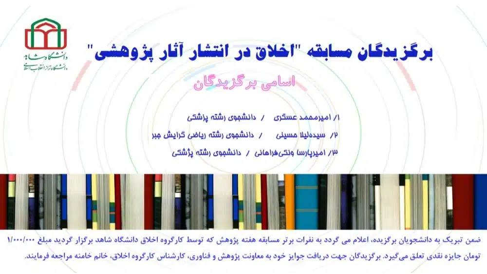 به مناسبت هفته پژوهش و جهت یادآوری قوانین مهم اخلاق در انتشار آثار پژوهشی، به همت کارگروه اخلاق در پژوهش دانشگاه شاهد و معاونت پژوهشی مسابقه «اخلاق در انتشار آثار پژوهشی» برگزار شد.