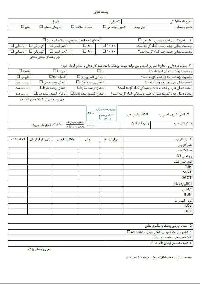 - تکمیل سایر بخشها (شامل فشار خون، آزمایشات پاراکلینیک و …) با مراجعه به پزشک عمومی