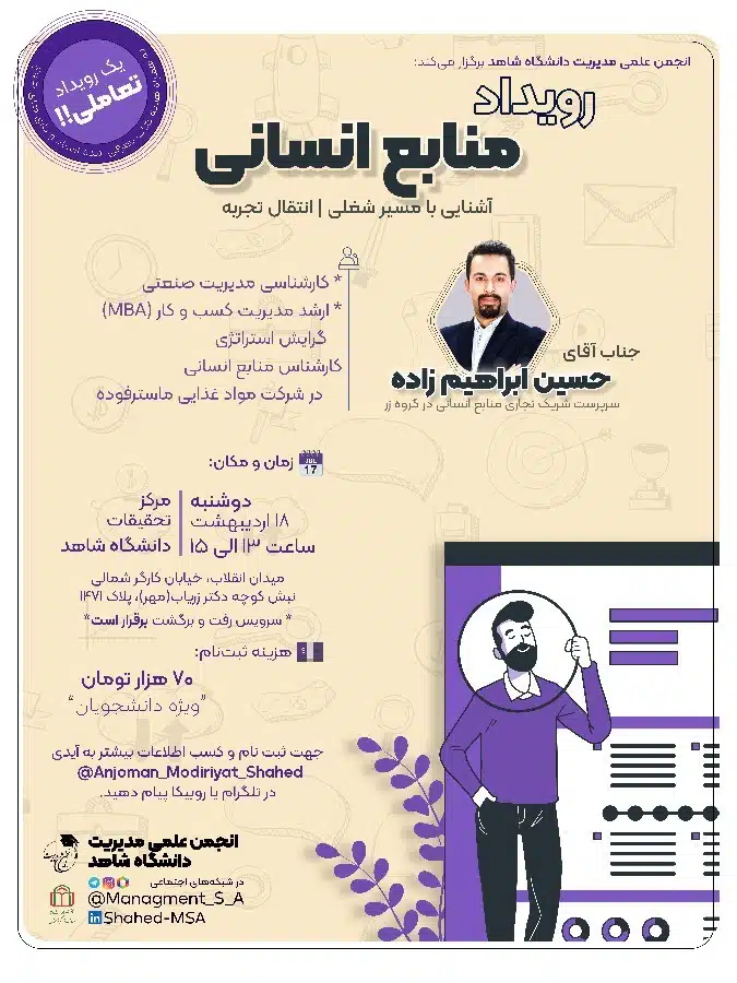 جهت ثبت نام و کسب اطلاعات بیشتر، نام و نام خانوادگی،شماره دانشجویی و رشته ی خود را به آیدی @anjoman_modiriyat_shahed  ارسال نمایید.