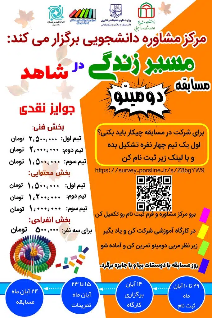 بنا بر گزارش روابط عمومی، برگزاری مسابقات دومینوی دانشجویی با عنوان مسیر زندگی درشاهد، توسط مرکز مشاوره دانشجویی این مسابقات به صورت تیمی و انفرادی و با هدف فرهنگ سازی در زمینه پیشگیری از آسیبهای روانی/ اجتماعی برگزارشده و مضمون اصلی آن را ترویج فرهنگ خودمراقبتی و طراحی مسیر زندگی سالم اختصاص تشکیل میدهد.
