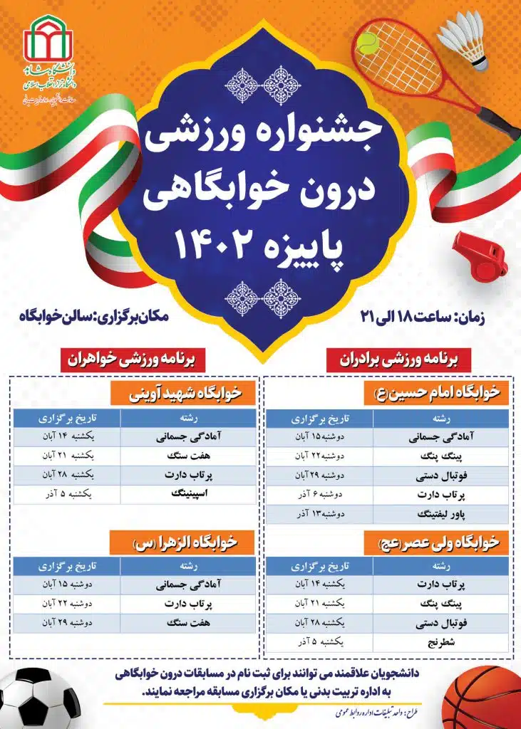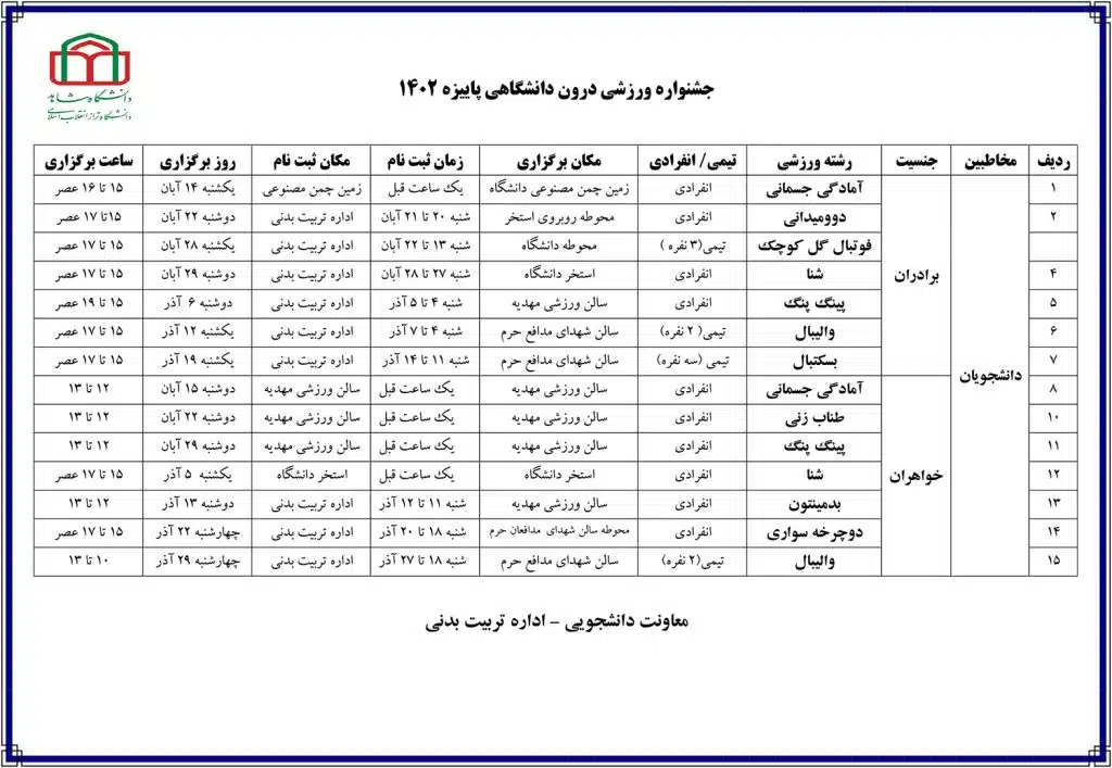 بنا بر گزارش روابط عمومی، اداره تربیت بدنی در نظر دارد مسابقات ورزشی درون خوابگاهی و درون دانشگاهی جشنواره پاییزه در دو بخش دختران و پسران برگزار نماید. دانشجویان علاقمند به شرکت در مسابقات برای ثبت نام براساس جداول ذیل به اداره تربیت بدنی یا مکان برگزاری مسابقه مراجعه نمایند.