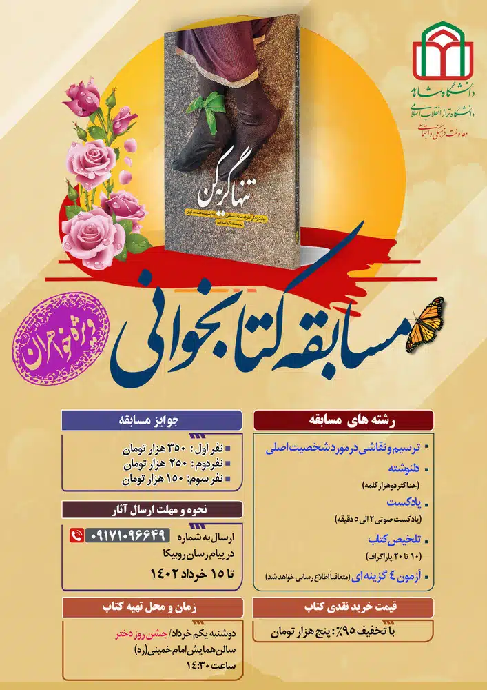 به گزارش «روابط عمومی» و به نقل از معاونت فرهنگی و اجتماعی مسابقه بزرگ کتابخوانی با موضوع کتاب تنها گریه کن (ویژه خواهران) برگزار می گردد.