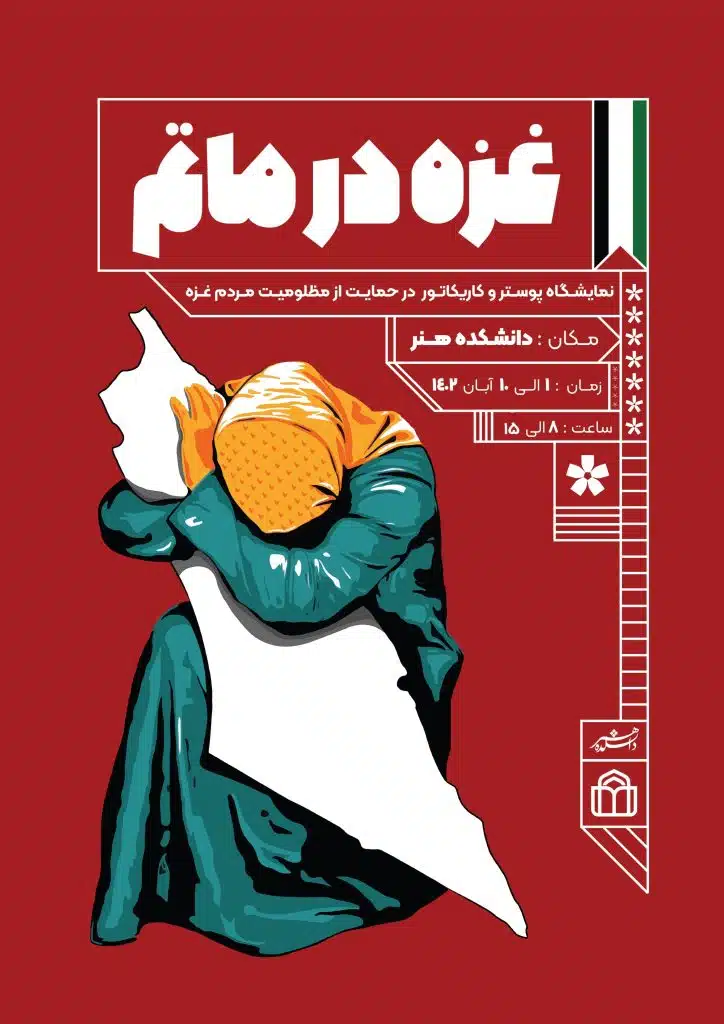 بنا بر گزارش روابط عمومی، نمایشگاه پوستر و کاریکاتور در حمایت از مظلومیت مردم غزه با عنوان «غزه در ماتم» از تاریخ 1 الی 10 آبان ماه 1402 در دانشکده هنر برگزار میگردد.