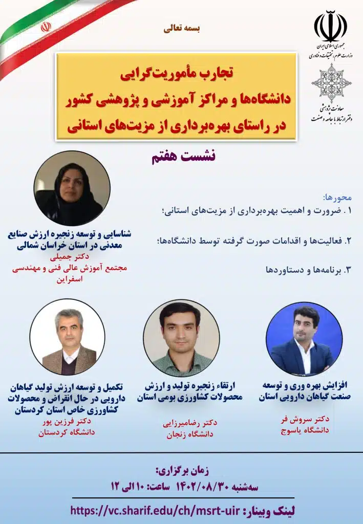 بنا بر گزارش روابط عمومی، هفتمین جلسه از سلسله وبینارهای ماموریتگرایی با موضوع "تجارب ماموریتگرایی دانشگاهها و مراکز آموزشی و پژوهشی کشور در راستای بهرهبرداری از مزیتهای استانی" سه شنبه 30 آذرماه 1402 با محورهای ذیل برگزار خواهد شد: