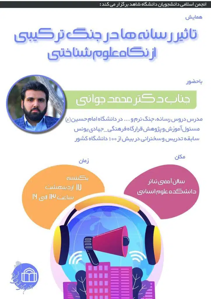 به گزارش «روابط عمومی» دانشگاه، همایش “تاثیر رسانه‌ها در جنگ ترکیبی از نگاه علوم شناختی” با حضور دکتر محمد جوانی، استاد دانشگاه امام حسین علیه السلام و مسئول آموزش پژوهش قرارگاه فرهنگی – جهادی یونس یکشنبه  ۱۷ اردیبهشت ماه 1402 از ساعت ۱۳ الی ۱۶ در سالن آمفی تئاتر دانشکده علوم انسانی برگزار می‌گردد.