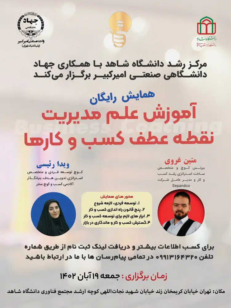 بنا بر گزارش روابط عمومی، “همایش رایگان آموزش علم مدیریت نقطه عطف کسب و کارها” به همت مرکز رشد دانشگاه شاهد و با همکاری جهاد دانشگاهی صنعتی امیرکبیر در تاریخ 1402/08/19 از ساعت 15 الی 19 در محل مجتمع فناوری دانشگاه شاهد واقع در خیابان کریمخان زند خیابان شهید اردشیر ارشد پلاک 6 (مجتمع فناوری دانشگاه شاهد) برگزار می‌گردد.
