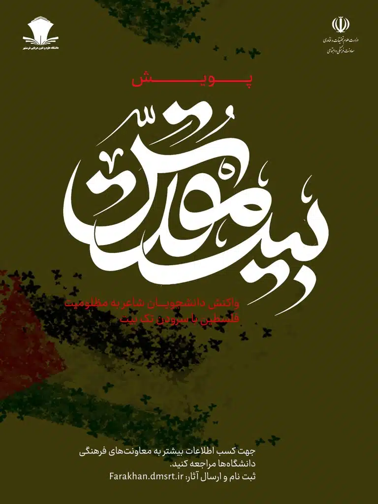 دانشجویان شاعر میتوانند تک بیتهای خود را با موضوع فلسطین و قدس شریف، در بازه زمانی پویش، با مراجعه به سامانه https://farakhan.dmsrt.ir/ به صورت فشرده و با کیفیت ارسال کنند.