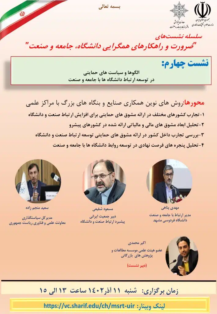 بنا بر گزارش روابط عمومی، چهارمین جلسه از سلسـله نشستهای ضرورت و راهکارهای همافزایی دانشگاه با صنعت و جامعه با موضوع “الگوها وسیاستهای حمایتی در توسعه ارتباط دانشگاهها با جامعه و صنعت”، شنبه 11 آذر ماه 1402 از ساعت 13 الی 15 با محورهای ذیل برگزار میگردد: