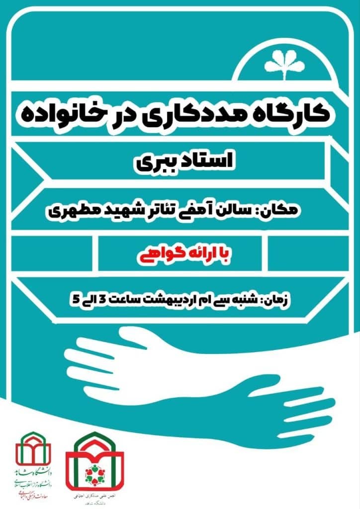 به گزارش «روابط عمومی» دانشگاه، کارگاه آموزشی مددکاری در خانواده به همت انجمن علمی مددکاری اجتماعی دانشگاه و با حضور استاد ببری شنبه ۳۰ اردیبهشت ماه ساعت ۱۵ الی ۱۷ در سالن آمفی تئاتر شهید مطهری دانشکده علوم انسانی برگزار میگردد.