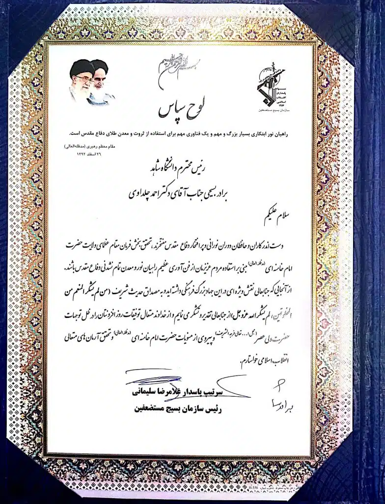 به گزارش «روابط عمومی»، با عنایت به حمایت حداکثری دانشگاه شاهد از بسیج دانشجویی در برگزاری اردوی راهیان نور سال ۱۴۰۱ با ظرفیت ۴۰۰ نفر و برگزاری اردوی راهیان نور ویژه اساتید دانشگاه، لوح تقدیری از سوی سرتیپ پاسدار سلیمانی، رئیس سازمان بسیج مستضعفین به آقای دکتر چلداوی، رئیس دانشگاه شاهد اهدا شده و در همایش تجلی اخلاص که در تاریخ ۱۱ تیر ماه ۱۴۰۲ در محل سازمان بسیج مستضعفین برگزار خواهد شد از رئیس دانشگاه تقدیر به عمل خواهد آمد.