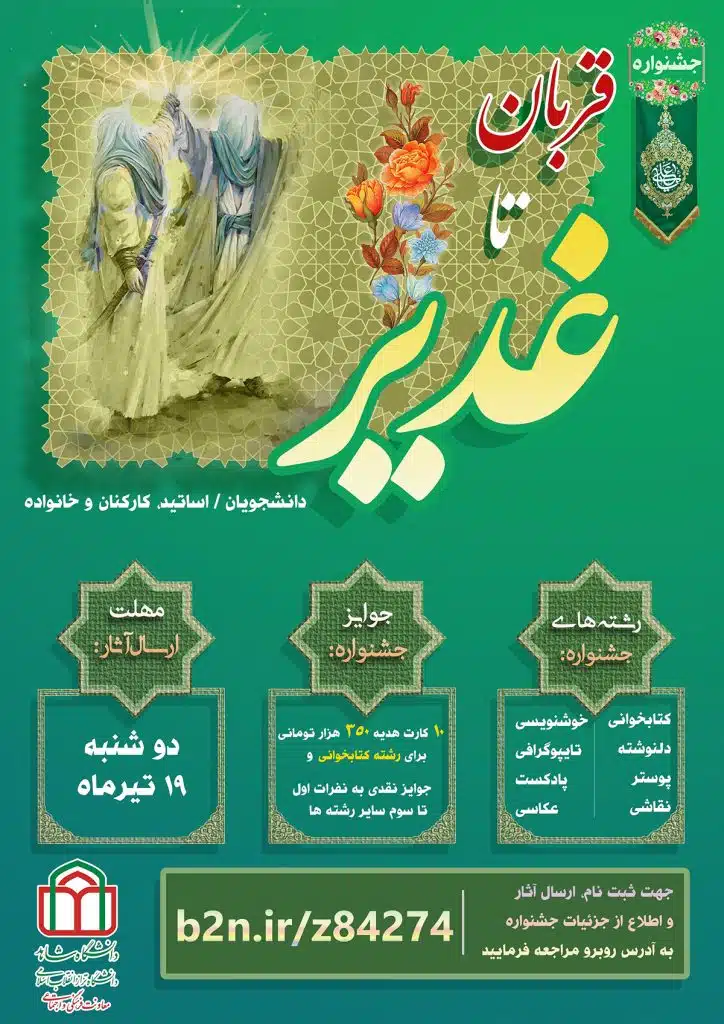 به گزارش «روابط عمومی»، معاونت فرهنگی و اجتماعی دانشگاه همزمان با ایام مبارک دهه ولایت، اقدام به برگزاری «جشنواره قربان تا غدیر» در عرصه های کتابخوانی، عکاسی، دلنوشته، خوشنویسی، تایپوگرافی، نقاشی، طراحی پوستر و پادکست نموده است.