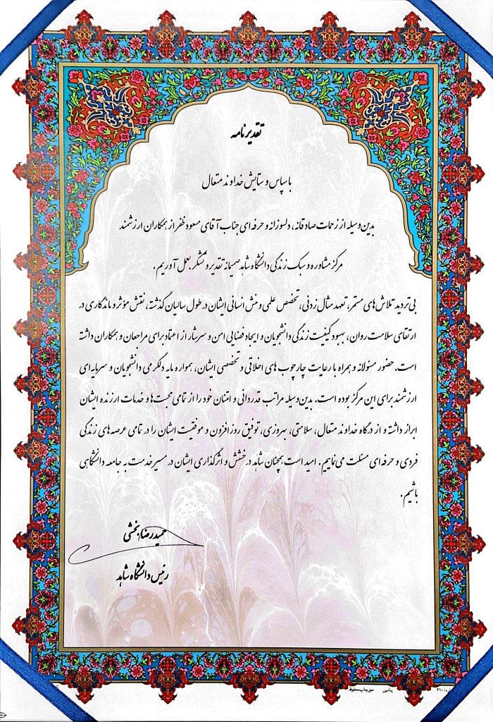 در حاشیه این جلسه طی حکمی از سوی رئیس دانشگاه، از آقای مسعود ظفر؛ کارشناس مسئول مرکز مشاوره و سبک زندگی به سبب سالها تلاش و فعالیت در جهت پیشگیری و مداخله در حوزه آسیبهای اجتماعی دانشگاهیان؛ تقدیر به عمل آمد.