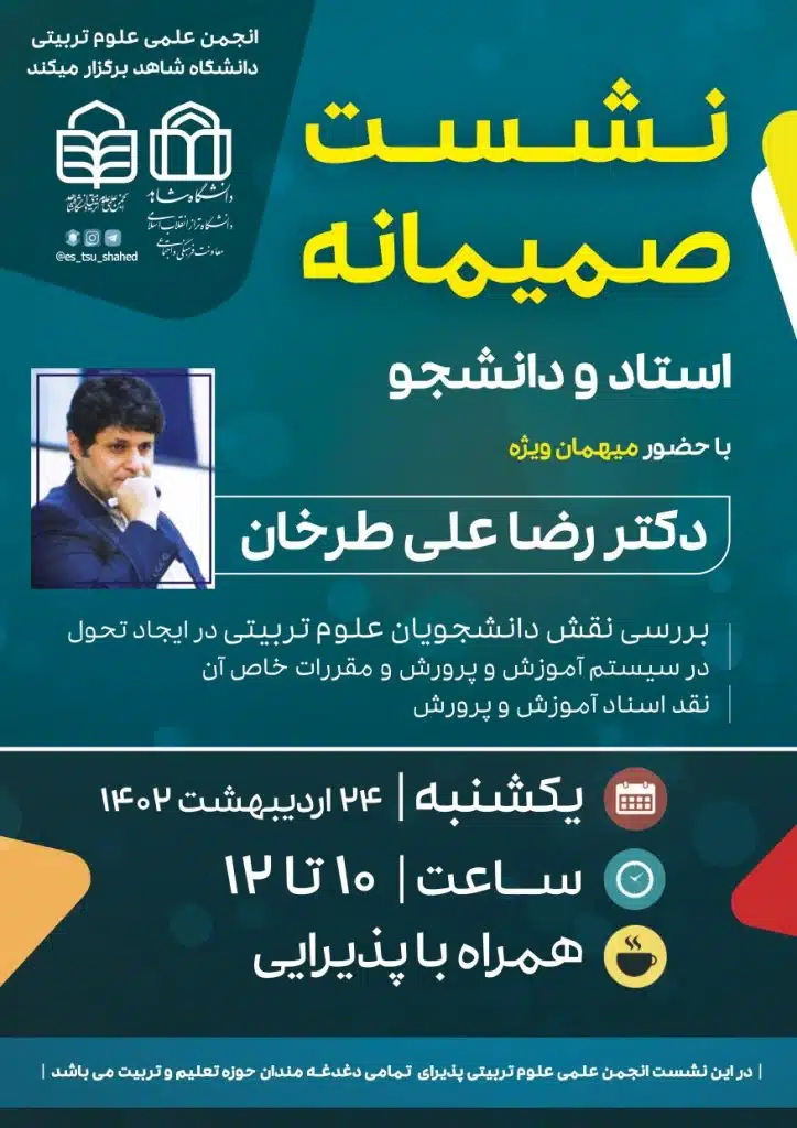 به گزارش «روابط عمومی» دانشگاه، دورهمی صمیمانه استاد و دانشجو به همت انجمن علمی علوم تربیتی دانشگاه یکشنبه ۲۴ اردیبهشت ساعت ۱۰ تا ۱۲ در محوطه روبه روی دانشکده انسانی با حضور دکتر رضا علی طرحان برگزار می گردد.