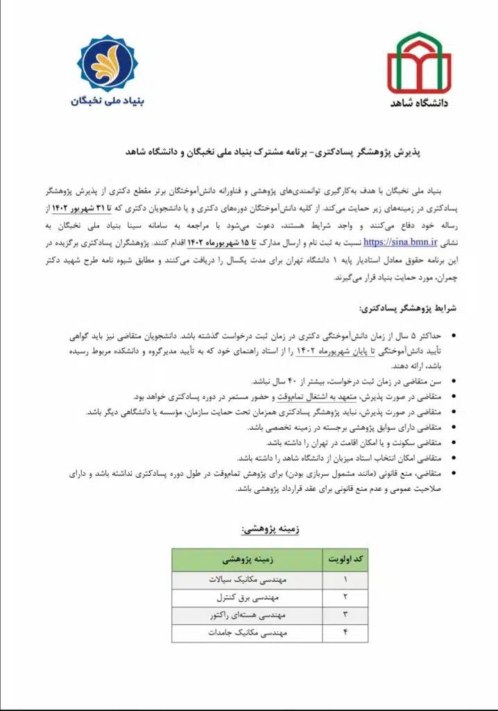 فرصت جذب پژوهشیار در دوره های پسادکتری از میان فارغ التحصیلان رشته های مهندسی هسته ای و رآکتور، مهندسی مکانیک(سیالات، جامدات) و مهندسی برق_کنترل در دانشگاه شاهد با حمایت بنیاد ملی نخبگان