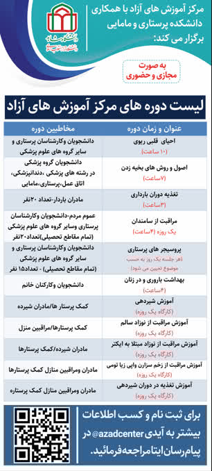 به گزارش «روابط عمومی» دانشگاه، مرکز آموزش‌های آزاد با همکاری دانشکده پرستاری و مامایی دوره‌های آموزشی زیر را به صورت مجازی و حضوری برگزار می‌نماید.