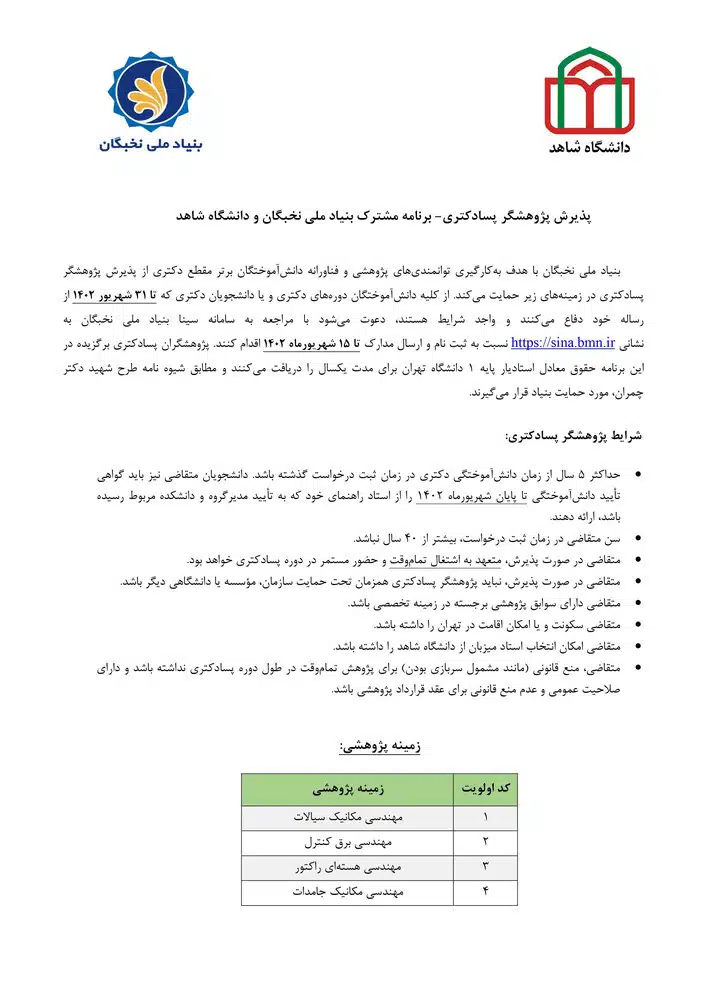 فرصت جذب پژوهشیار در دورههای پسادکتری مهندسی مکانیک (سیالات، جامدات)، مهندسی برق کنترل و مهندسی هستهای رآکتور در دانشگاه شاهد با حمایت بنیاد ملی نخبگان