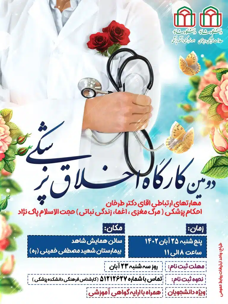 بنابر گزارش روابط عمومی دانشگاه شاهد، دومین کارگاه اخلاق پزشکی با ارائه دکتر طرخان با موضوع مهارت های ارتباطی و حجت الاسلام پاک نژاد با موضوع احکام پزشکی (مرگ مغزی، اغما، زندگی نباتی) روز پنج شنبه 25 آبانماه 1402 در بیمارستان شهید مصطفی خمینی (ره) برگزار گردید.