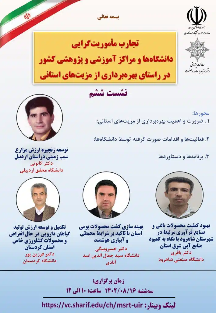 بنا بر گزارش روابط عمومی، ششمین نشست از سلسله وبینارهای ماموریت گرایی با موضوع “تجارب ماموریتگرایی دانشگاهها و مراکز آموزشی و پژوهشی کشور در راستای بهرهبرداری از مزیتهای استانی” سه شنبه 16 آبان ماه 1402 ساعت 10 الی 12 برگزار میگردد.