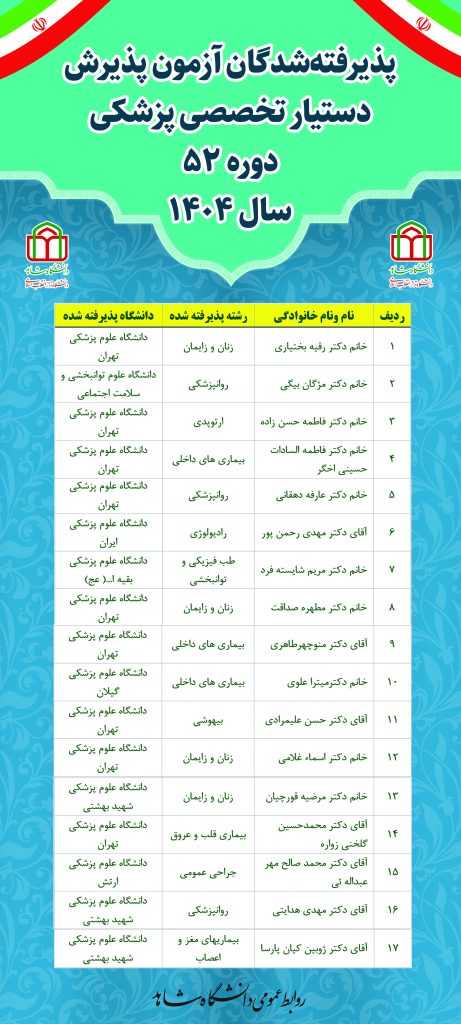 فهرست پذیرفته شدگان آزمون پذیرش دستیار تخصصی پزشکی دوره 52 سال 1404 – فارغ التحصیلان دانشگاه شاهد