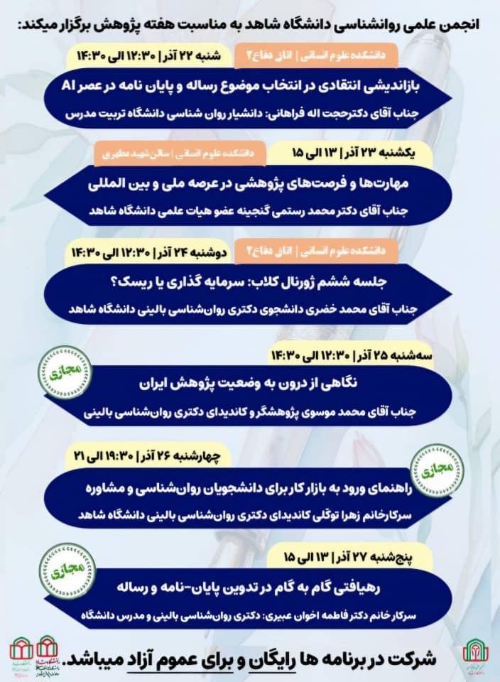 انجمن علمی روانشناسی دانشگاه شاهد به مناسبت هفته پژوهش برگزار می کند