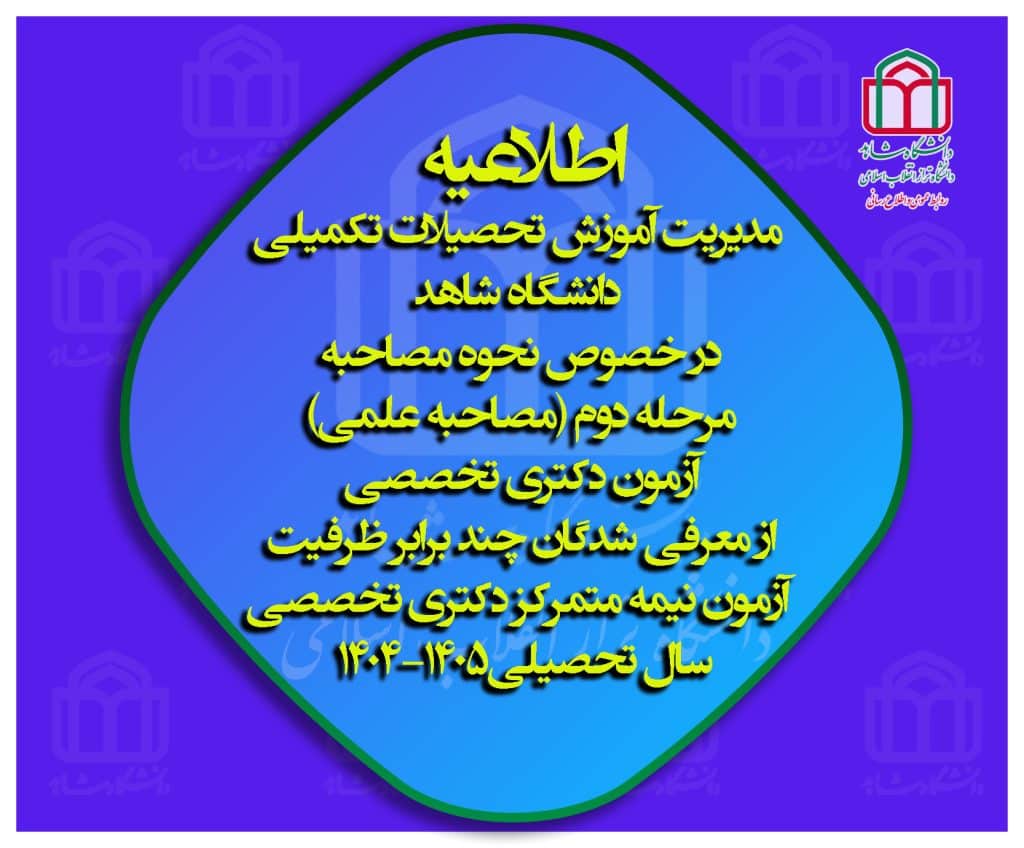 اطلاعیه مدیریت آموزش تحصیلات تکمیلی دانشگاه شاهد، در خصوص نحوه مصاحبه مرحله دوم (مصاحبه علمی) آزمون دکتری تخصصی از معرفی شدگان چند برابر ظرفیت آزمون نیمه متمرکز دکتری تخصصی سال تحصیلی1405-1404