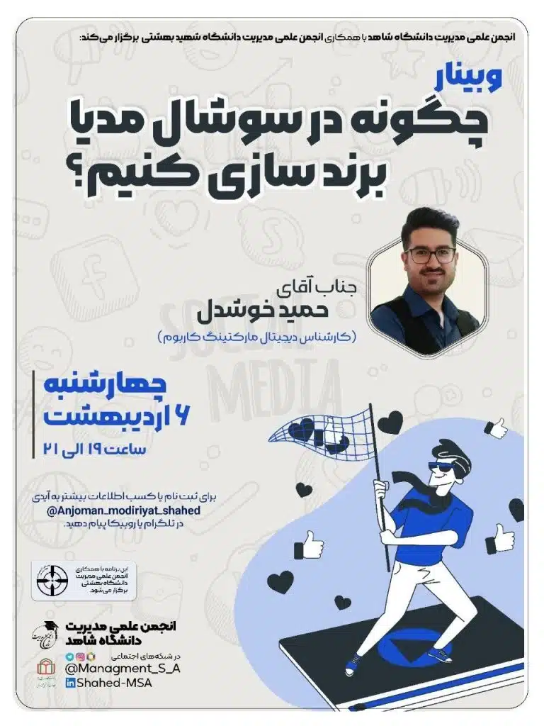 به گزارش «روابط عمومی»، انجمن علمی دانشجویی مدیریت دانشگاه شاهد با همکاری انجمن مدیریت دانشگاه شهیدبهشتی چهارشنبه ۶ اردیبهشت ماه ساعت ۱۹ الی ۲۱ وبینار «چگونه در سوشال مدیا برندسازی کنیم؟» برگزار می نماید.