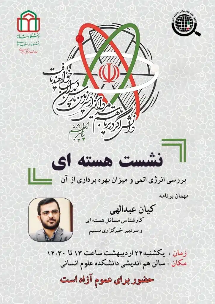 به گزارش «روابط عمومی» دانشگاه، نشست هسته‌ای بررسی ابعاد انرژی هسته‌ای و آورده‌های آن برای کشور به همت انجمن علمی علوم‌سیاسی دانشگاه یکشنبه 24 اردیبهشت ماه 1402 ساعت 13 الی 14:30 در سالن هم‌اندیشی دانشکده علوم انسانی