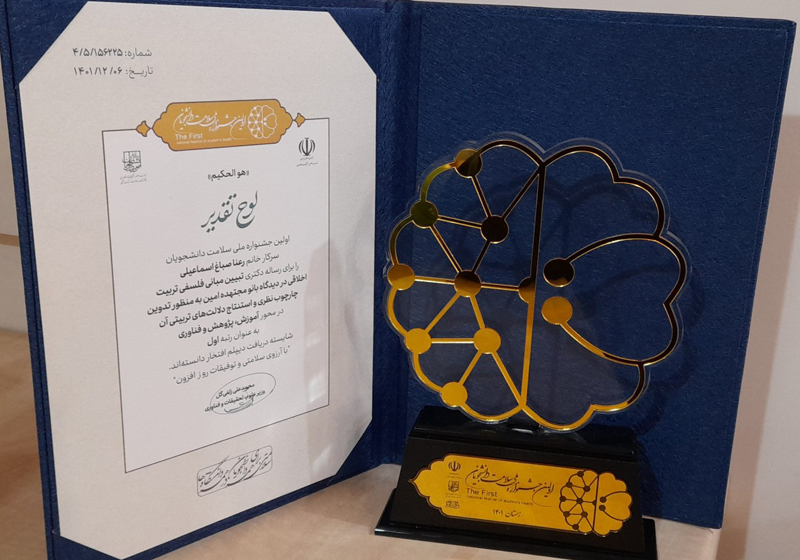 این جشنواره در میان رساله ها و پایان نامهها و طرحهای پژوهشی ارسالی از دانشگاههای کشور برگزار گردید و رساله خانم رعنا صباغ اسماعیلی دانشجوی دکتری رشته فلسفه تعلیم و تربیت دانشگاه شاهد با عنوان “تبیین مبانی فلسفی تربیت اخلاقی در دیدگاه بانو مجتهده امین به منظور تدوین چارچوب نظری و استنتاج دلالتهای تربیتی آن در محور آموزش، پژوهش و فناوری” موفق به کسب رتبه اول شد.